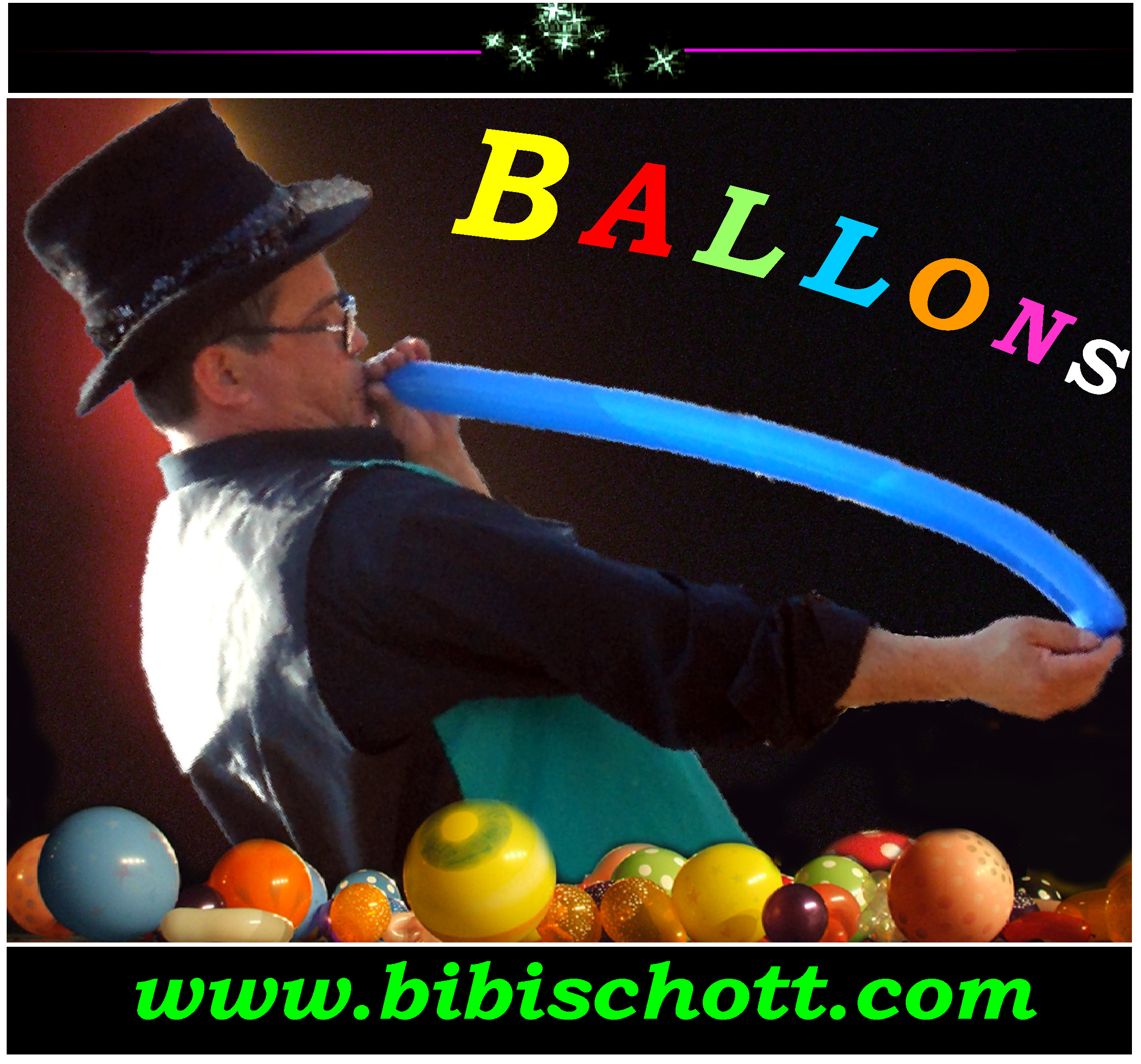Bibi-Schott donne vie à ses ballons qui en un tour de main, se transforment comme par enchantement en perroquet, escargot, fleur, papillon, moto, chien….